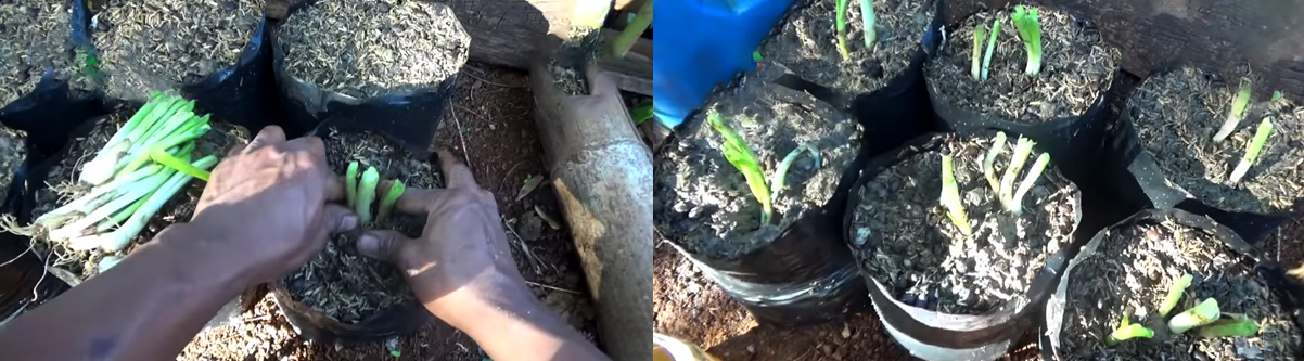 Setelah bibit direndam selama 6 jam, saatnya bibit ditanam pada polybag. Caranya yaitu dengan membuat lubang tanam pada polybag kemudian masukkan 1 bibit untuk 1 lubang tanam karena nantinya akan tumbuh makan baru, kemudian tutup kembali dengan sedikit dipadatkan agar bibit erat tertanam dan tidak goyah. Dalam 1 polybag dapat ditanami beberapa bibit bawang daun menyesuaikan kelebaran diameter polybag, kemudian siram secukupnya.