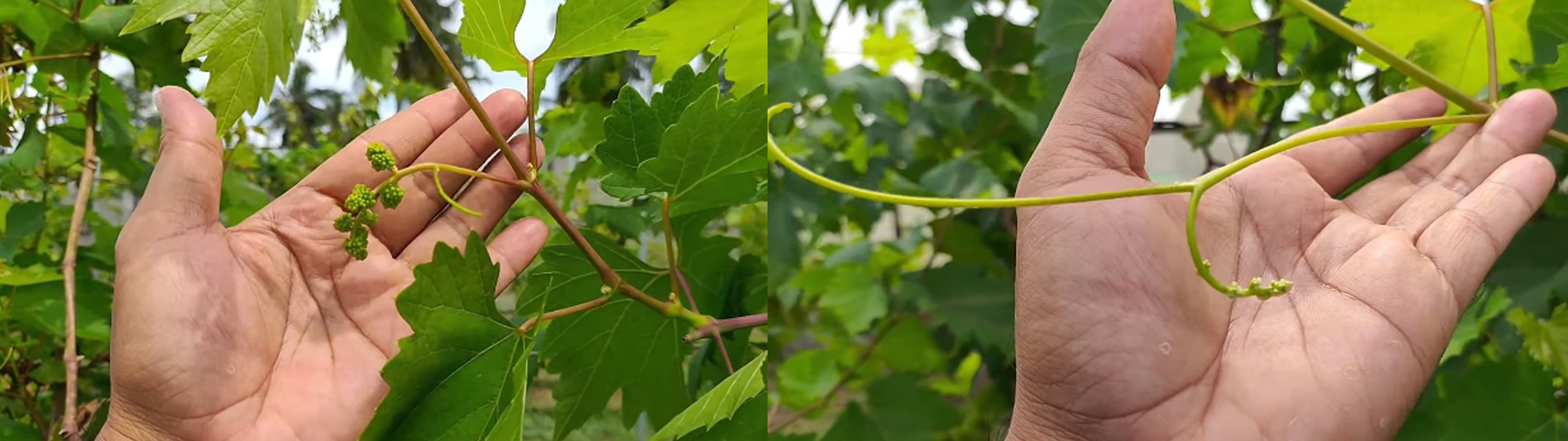 Bunga yang muncul tersebut umumnya terdiri dari 2 jenis, yang pertama yaitu bunga yang muncul dari ketiak daun, yang mana bunga ini memang benar-benar bunga sesungguhnya yang akan menjadi buah anggur dan yang kedua bunga yang muncul dari sulur. Nah agar bunga yang muncul dari sulur ini benar-benar menjadi bunga dan buah, maka perlu ada sedikit perlakuan dengan memangkas sulur yang tidak ada bunganya, hingga menyisakan sulur yang ada bunganya saja, sehingga bunganya akan lebih cepat membesar.