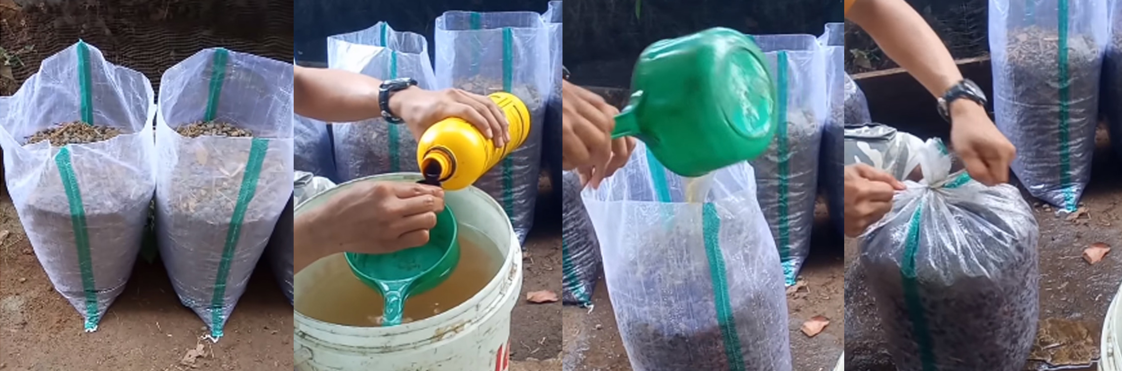 Siramkan pada kotoran kambing yang telah dimasukkan pada karung secara perlahan sedikit demi sedikit hingga merata sambil membolak-balikkannya. Pemberian air larutan aktivator ini cukup hanya sampai lembab saja jangan terlalu basah.