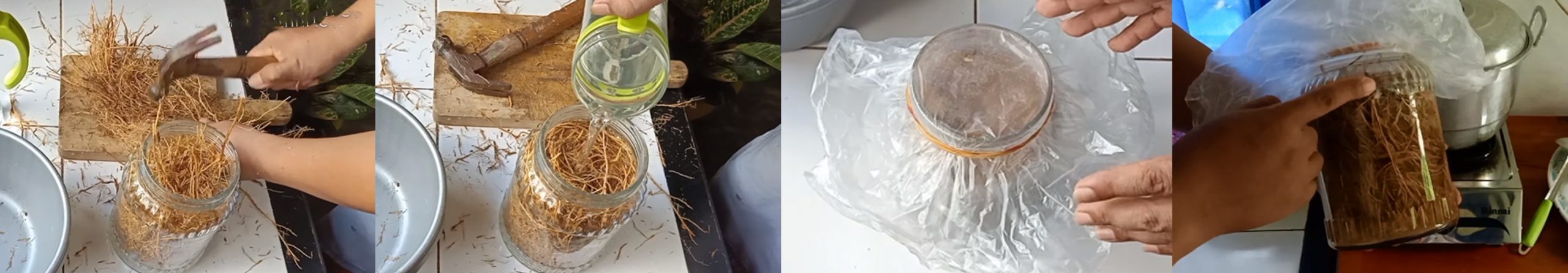 • Masukkan akar bambu ke dalam toples, akan tetapi geprek atau pukul-pukul menggunakan palu hingga kira-kira akar pecah-pecah