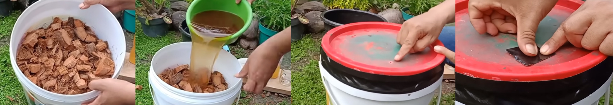 Cacah atau potong-potong kecil sabut kelapa, masukkan cacahan sabut kelapa ke dalam ember kapasitas 20 liter hingga ¾ bagian ember.