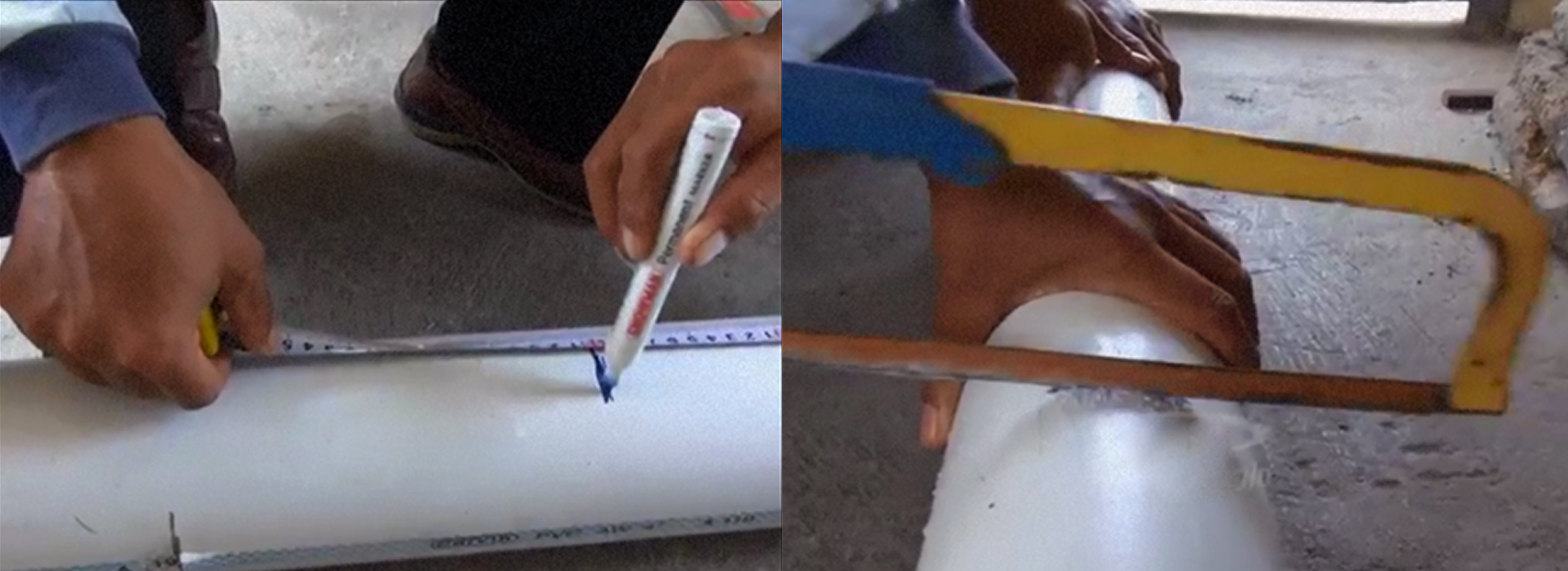 - Lubang tanam dibuat menyilang dengan ukuran jarak sekitar 60 cm, setelah tempat yang akan dijadikan lubang tanam siap, selanjutnya gergaji paralon dengan lebar kurang lebih 5 cm