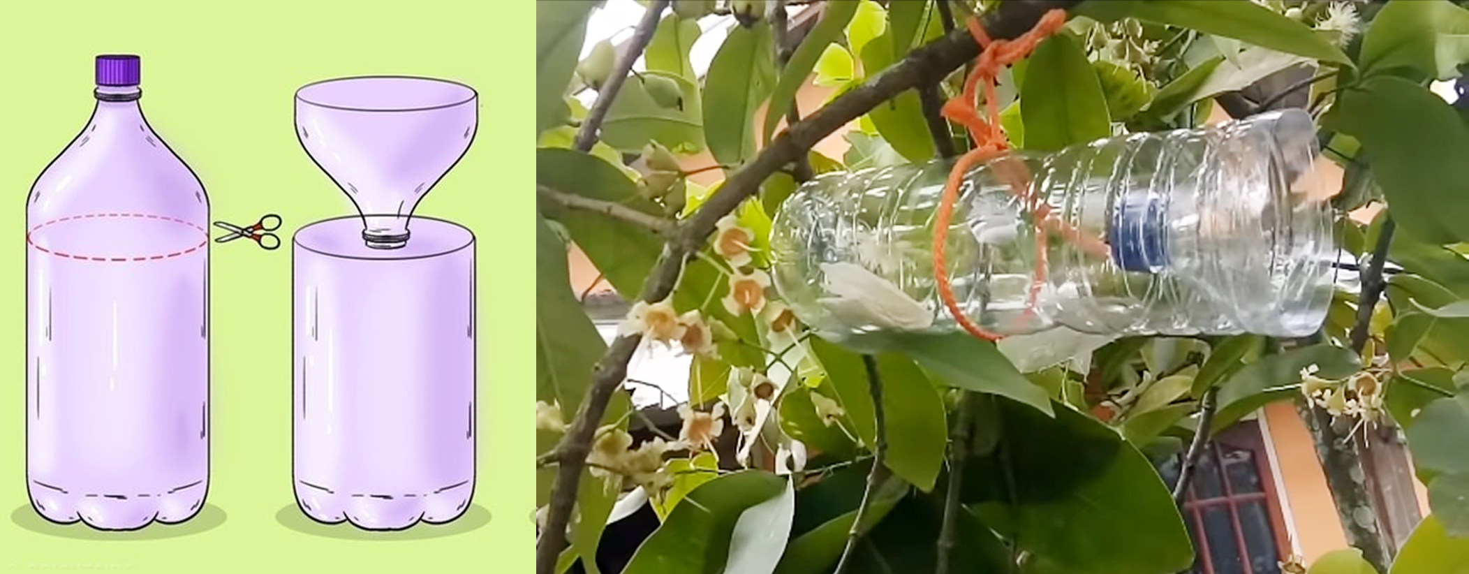 • Pastikan botol bekas yang digunakan sudah bersih, potong bagian ujungnya kira-kira 10 cm dari tutupnya. Lubangi tutup botol seukuran kira-kira lalat buah bisa masuk lubang tersebut.