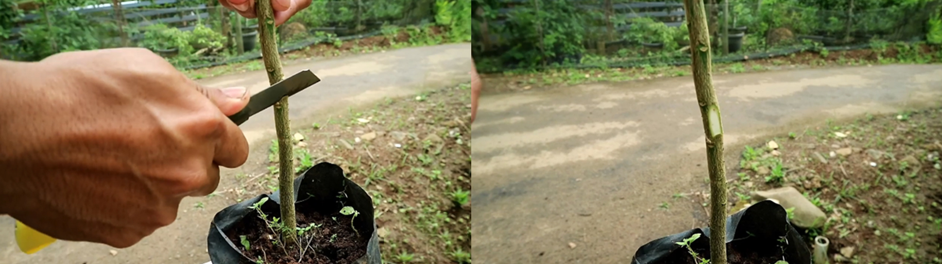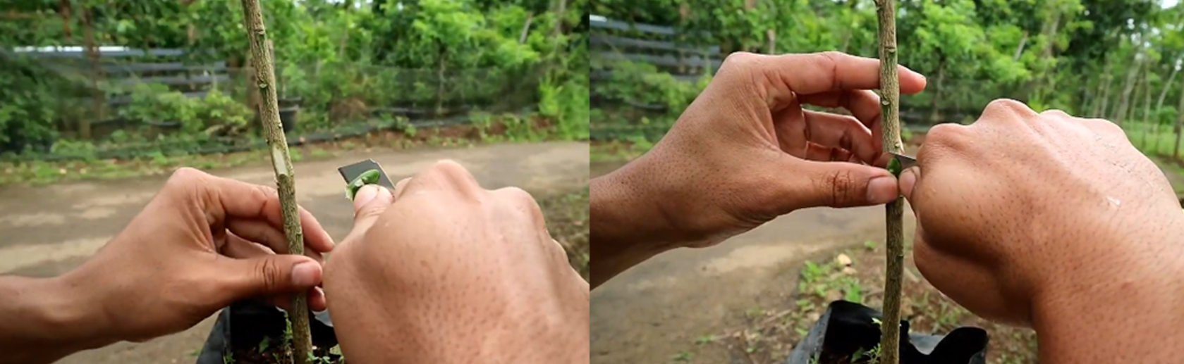 Sayat batang bawah sepanjang 2-3 cm, pada ketinggian 20 cm dari pangkal batang, penyayatan dilakukan dari atas ke bawah, potong kulit sayatan akan tetapi sisakan sedikit kulit sayatan yang fungsinya untuk menutup tempelan nantinya.