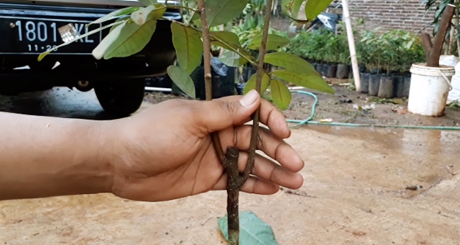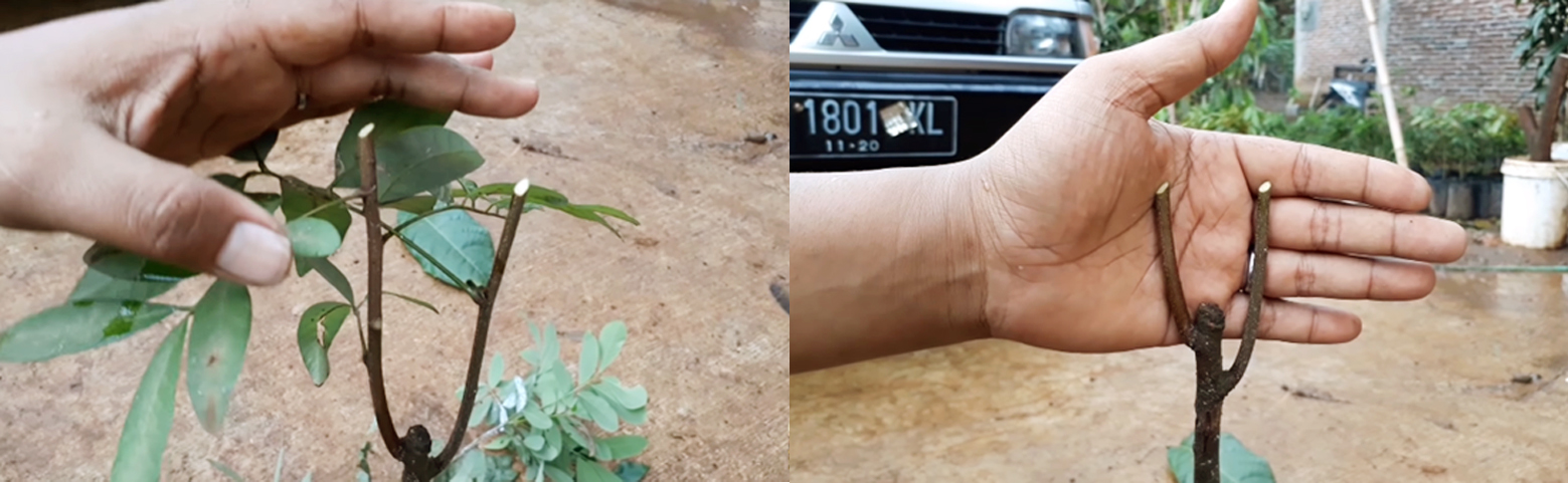 Karena disini kita akan membuat sambung pucuk kombinasi dengan 2 sambungan maka terlebih dahulu kita harus membuat batang bawah bercabang 2, caranya adalah dengan memotong batang bawah agar memiliki tunas baru yang akan menjadi cabang, jika tumbuh beberapa tunas, sisakan 2 tunas saja. Tunggu hingga tunas tersebut berukuran sekitar sebesar pensil.