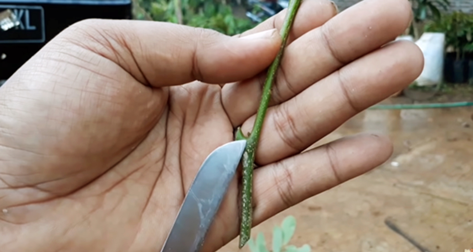 - Potong entres pilihan kemudian pangkas semua daunnya, entres minimal memiliki 2 mata tunas, pada saat pemangkasan daun hal yang perlu diperhatikan adalah dengan menyisakan sedikit batang dari tangkai daun dimana fungsinya untuk melindungi mata tunas yang nantinya akan tumbuh menjadi cabang baru.