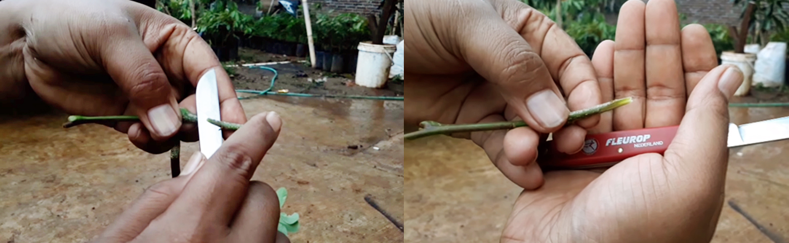 - Entres yang sudah siap untuk disambungkan kemudian disayat kanan kirinya agar membentuk lancip seperti baji, penyayatan diusahakan selurus mungkin agar nantinya saat entres disambungkan dapat menempel sempurna dengan batang bawah.
