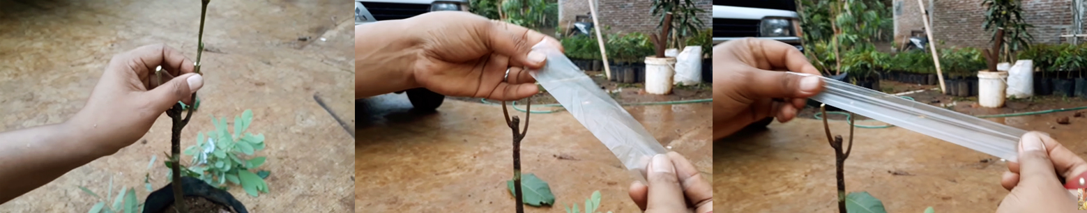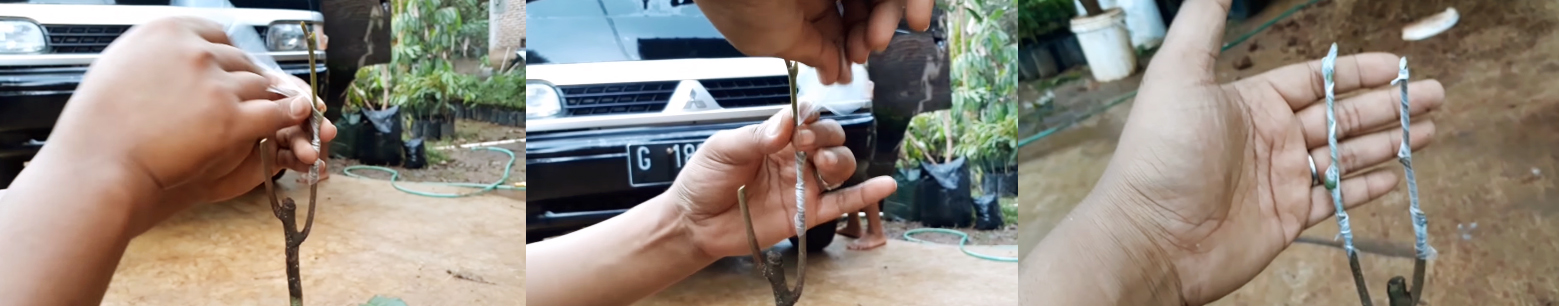 - Jika pengikatan menggunakan plastik es lilin maka sebelum digunakan untuk mengikat, plastik ditarik terlebih dahulu agar memanjang kemudian dibelah menggunakan cutter/pisau.