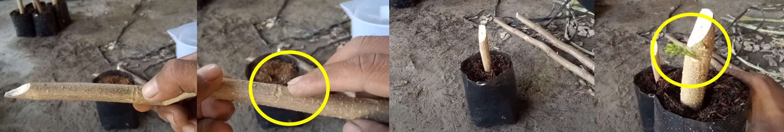 Sayat miring pada pangkal batang yang akan ditancapkan pada media tanam untuk memperluas area tumbuhnya akar, sayat miring pula ujung atasnya agar air siraman atau air hujan tidak mengendap pada batang yang dapat mengakibatkan busuknya batang stek.