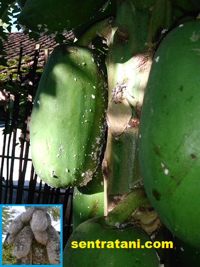 Putih-putih pada buah pepaya, pada daun dan pada batangnya adalah “hama kutu” ada yang menyebut “kutu kebul”. Serangan hama ini terutama pada tanaman pepaya yang sedang berbuah dengan gejala buah pepaya menjadi berwarna hitam. Apabila terjadi serangan berat, buah akan membusuk dan keriput. Hama kutu putih ini apabila menyerang daun, akan menunjukkan gejala kerdil dan memberi pengaruh terhadap proses pertumbuhan tanaman itu sendiri. Apabila menyerang pada bahagian batang akan menunjukkan gejala kehitam-hitaman pada batang yang terkena, serangan berat akan mengakibatkan buah gugur dan batang membusuk serta dalam waktu tidak begitu lama batang akan mati.
