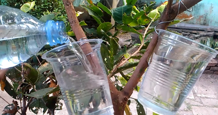 Sisipkan gelas pada sayatan yang telah dibuat sebelumnya, ikat gelas plastik menggunakan kawat atau tali pengikat sejenisnya pada lubang yang telah dibuat.