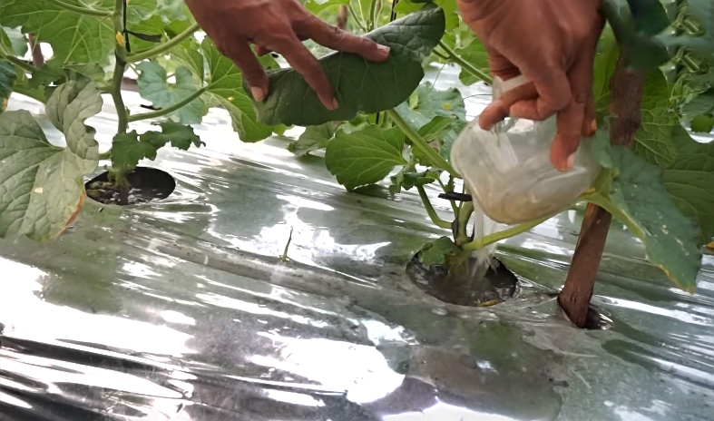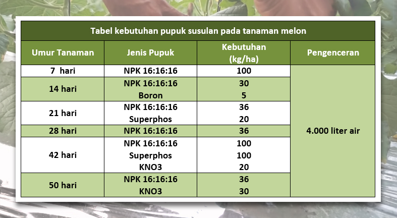Pupuk susulan tanaman melon diberikan dalam 6 tahap, yaitu pada usia 7, 14, 21, 28, 42 dan 50 HST.