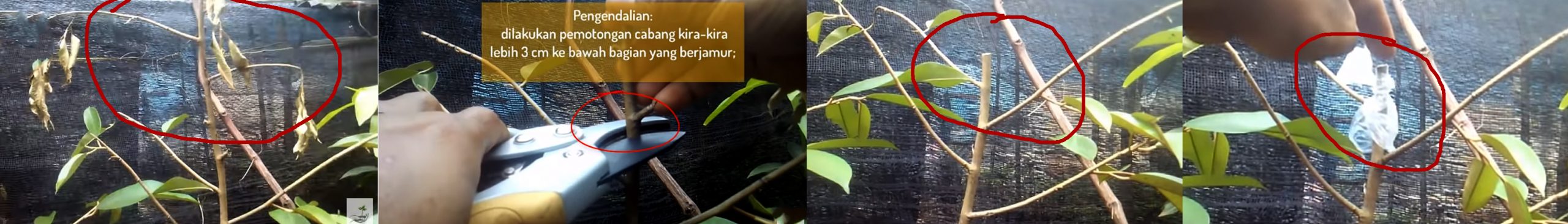 Misalnya pada tanaman yang masih kecil atau bibit, pangkaslah batang atau cabang yang terserang di bawah bagian batang yang terinfeksi jamur, kemudian luka bekas potongan diolesi dengan fungisida, lalu ditutup dengan plastik.