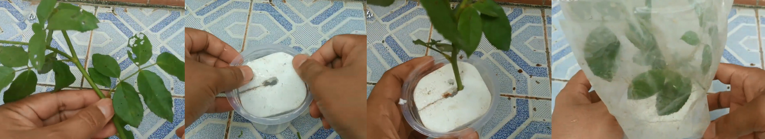 Masukkan air ke dalam wadah yang telah disiapkan, yaitu berupa cup/gelas plastik transparan atau wadah sejenis lainnya sebagai media tanamnya. Tutup menggunakan gabus/styrofoam yang telah diberi lubang ditengahnya untuk menopang batang stek, lalu masukkan batang stek pada media air tersebut.
