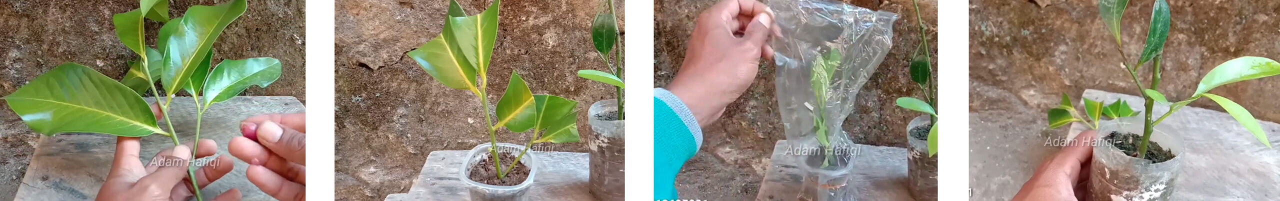 Sungkup menggunakan plastik transparan, ikat plastik sungkup pada cup agar tidak mudah lepas dan mengurangi penguapan. Selama penyungkupan tidak perlu dilakukan penyiraman hingga akar tumbuh.